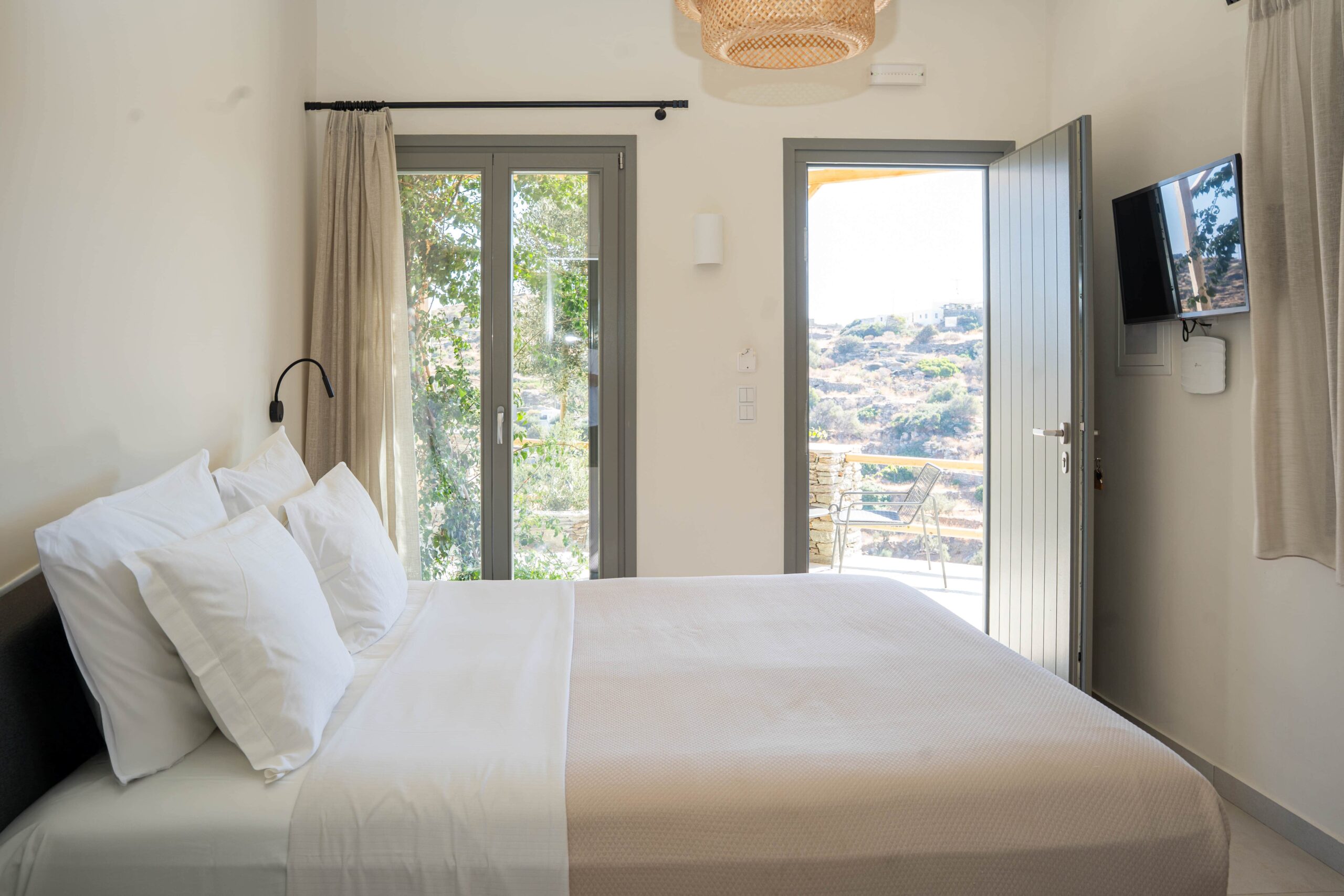 Εξωτερικά, το δωμάτιο διαθέτει ιδιωτική βεράντα με ξαπλώστρες και τραπέζι, το ιδανικό σημείο για να χαλαρώσετε και να απολαύσετε τον καφέ σας, αγναντεύοντας το παρθένο τοπίο και το απέραντο Αιγαίο από ψηλά.